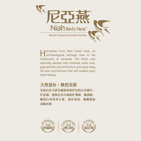 Harvested from Niah Great Cave, an archaeological heritage cave in the rainforests of Sarawak. The bird's nest naturally packed with minerals, sialic acid, glycoprotein and nutrients to give your body the best nourishment that will awaken your inner beauty.