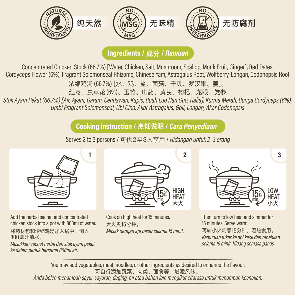 Concentrated Chicken Stock (66.7%) [Water, Chicken, Salt, Mushroom, Scallop, Monk Fruit, Ginger], Red Dates, Cordyceps Flower (6%), Fragrant Solomonseal Rhizome, Chinese Yam, Astragalus Root, Wolfberry, Longan, Codonopsis Root