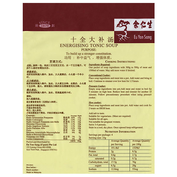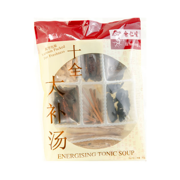 Radix Rehmanniae Praeparata, Radix Codonopsis, Radix Astragali Praeparata cum Melle, Rhizoma Chuanxiong, Radix Angelicae Sinensis, Radix Paeoniae Alba, Poria, Rhizoma Atractylodis Macrocephalae, Radix et Rhizoma Glycryrrhizae, Praeparata cum Melle, Cortex Cinnamomi