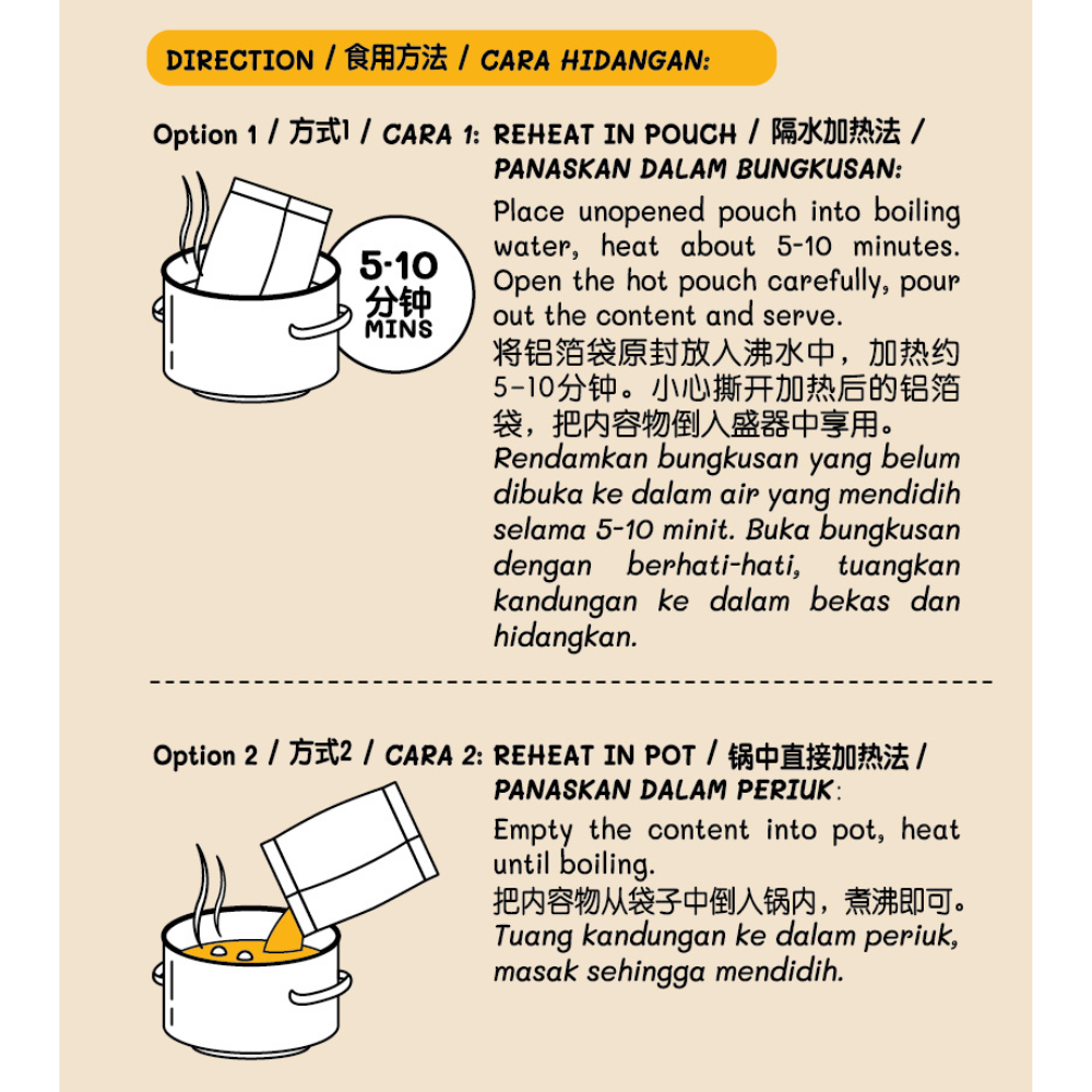 Place unopened pouch into boiling water, heat about 5-10 minutes. Open the hot pouch carefully, pour out the content and serve.