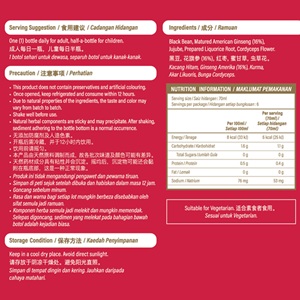 Eu Yan Sang Essence of American Ginseng is produced from selected matured American Ginseng infused with Black Bean, Jujube, Prepared Liquorice Root and Cordyceps Flower, using a signature combination of traditional method and state-of-the-art technology. Every drop of essence is fully preserved, pure, taste sweet and mellow. Essence of American Ginseng has the function of nourishing yin and qi, enhancing vitality and reducing fatigue. Essence of American Ginseng does not contain artificial colouring, flavouring, caramel or preservatives. Suitable for all ages.
