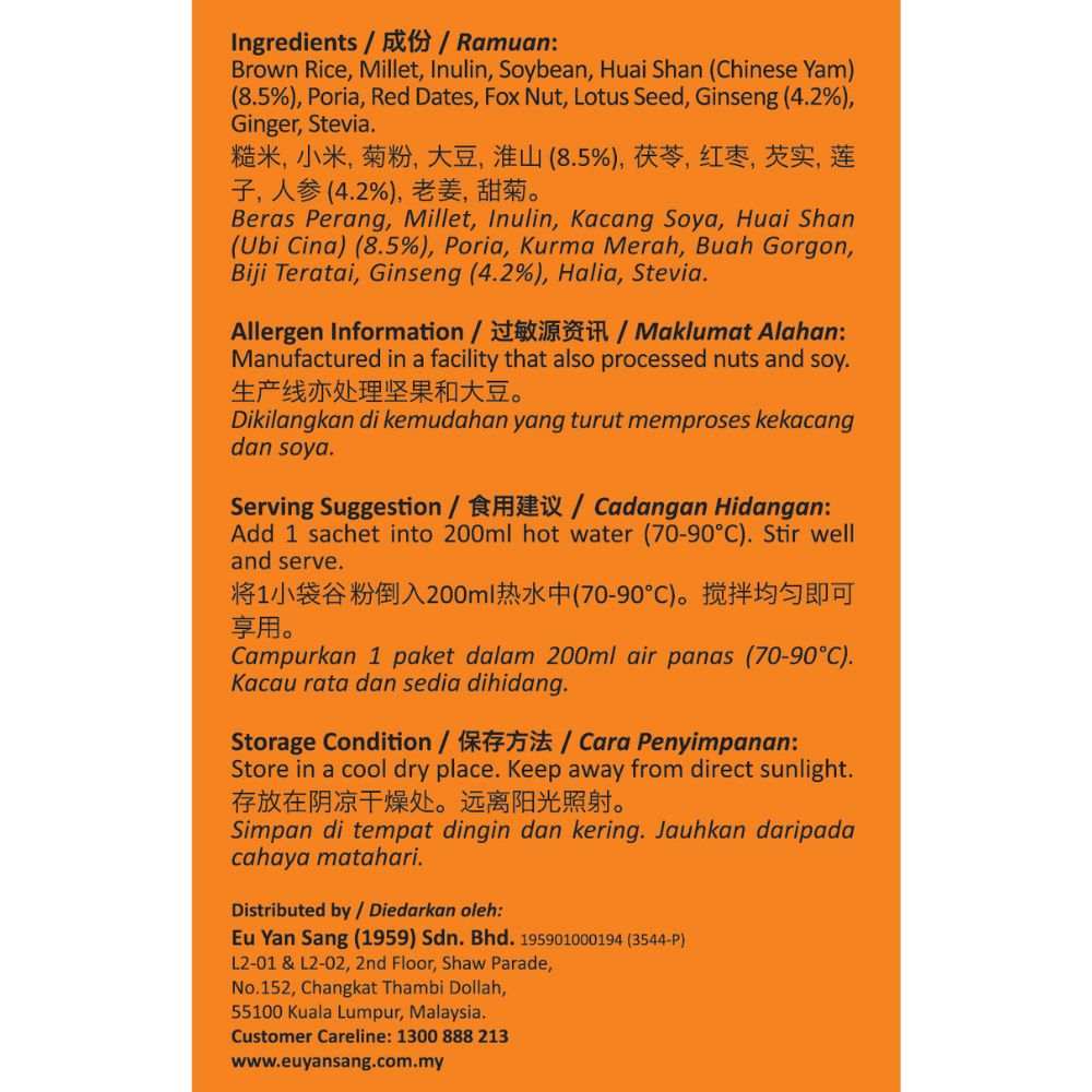 Brown Rice, Millet, Inulin, Soybean, Huai Shan (Chinese Yam) (8.5%), Poria, Red Dates, Fox Nut, Lotus Seed, Ginseng (4.2%), Ginger, Stevia.