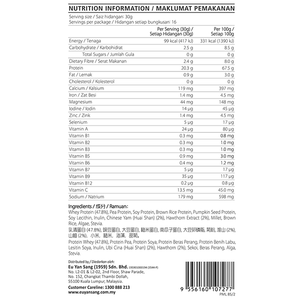 Is a well-balanced high quality protein drink. It is made from premium-grade grass-fed whey protein with no hormones or antibiotic. The formula is specially added traditional herbs of Huai Shan and Hawthorn to enhance absorption. Suitable for all ages and ideal as a meal replacement or nutrition support to keep your body healthy and fit.