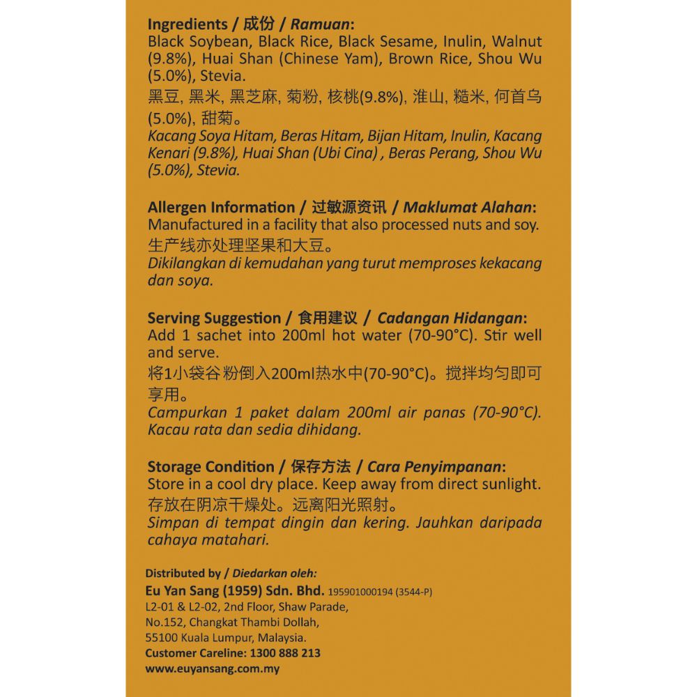 Black Soybean, Black rice, Black sesame, Inulin, Walnut (9.8%), Huai Shan (Chinese yam), Brown rice, Shou Wu (5.0%), Stevia.