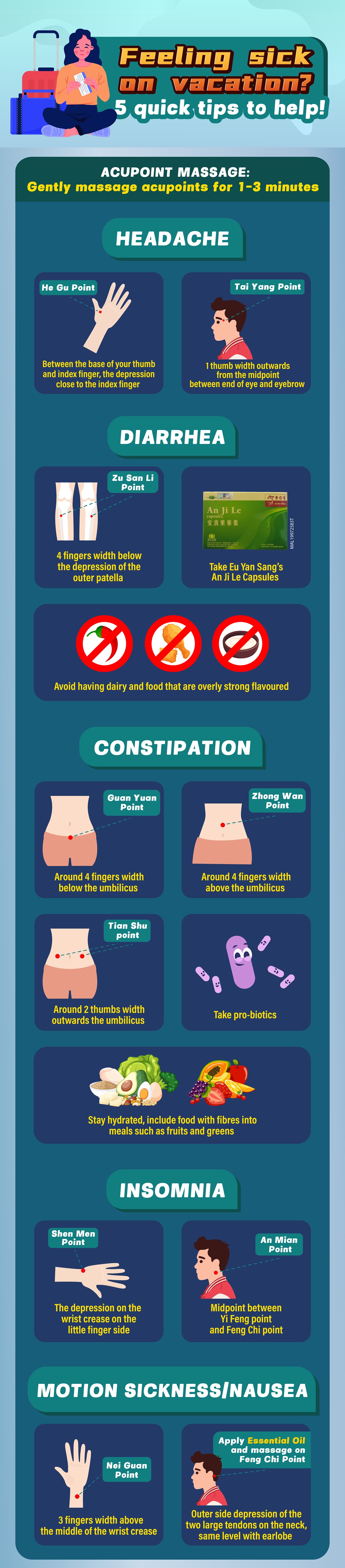 Besides preparing medication, you might want to try massaging acupoints to quickly relieve discomfort and pay attention to a few tips to recover faster and then enjoy the local food and scenery.