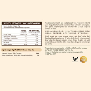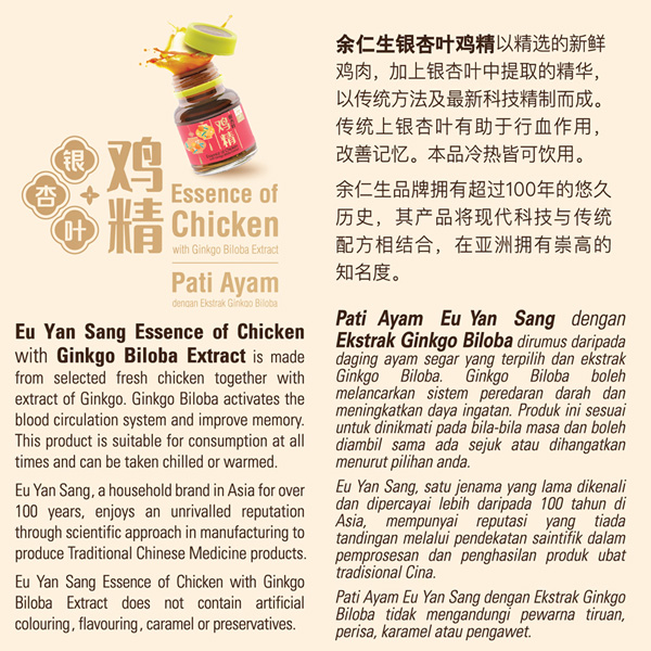 Eu Yan Sang Essence of Chicken with Ginkgo Biloba Extract does not contain artificial colouring, flavouring, caramel or preservatives.