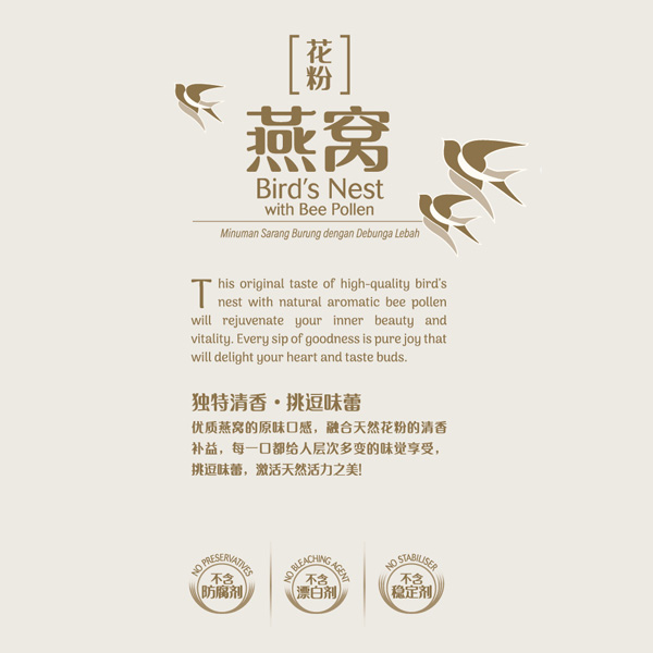 This original taste of high-quality bird’s nest with natural aromatic bee pollen will rejuvenate your inner beauty and vitality. Every sip of goodness is pure joy that will delight your heart and taste buds.