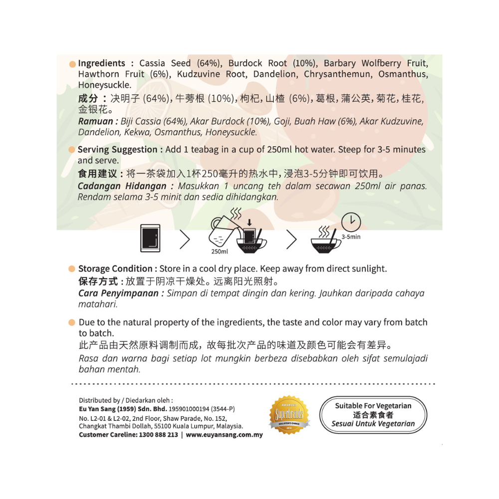 Cassia Seed (64%), Burdock root (10%), Barbary Wolfberry Fruit, Hawthorn Fruit (6%), Kudzuvine root, Dandelion, Chrysanthemun, Osmanthus, Honeysuckle.