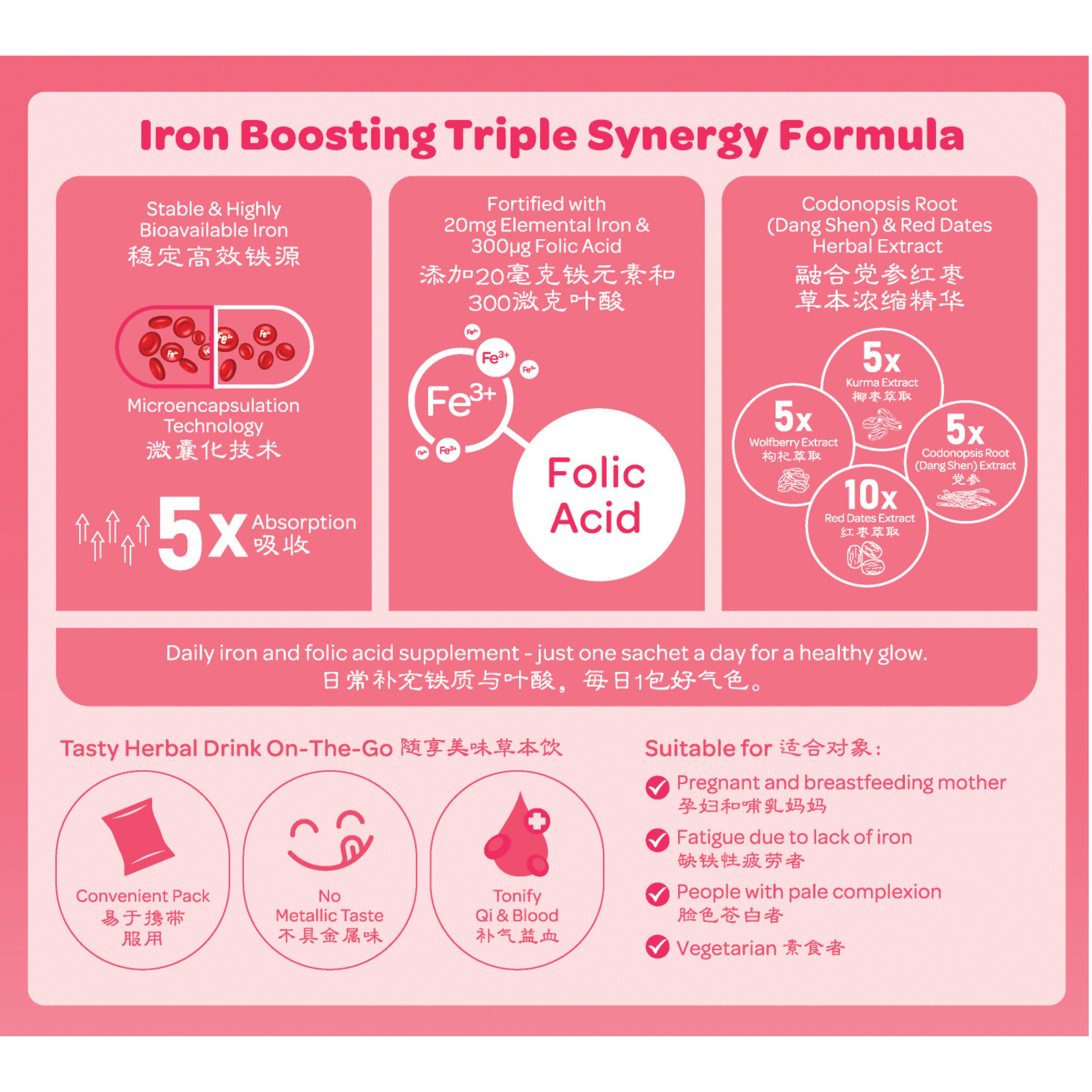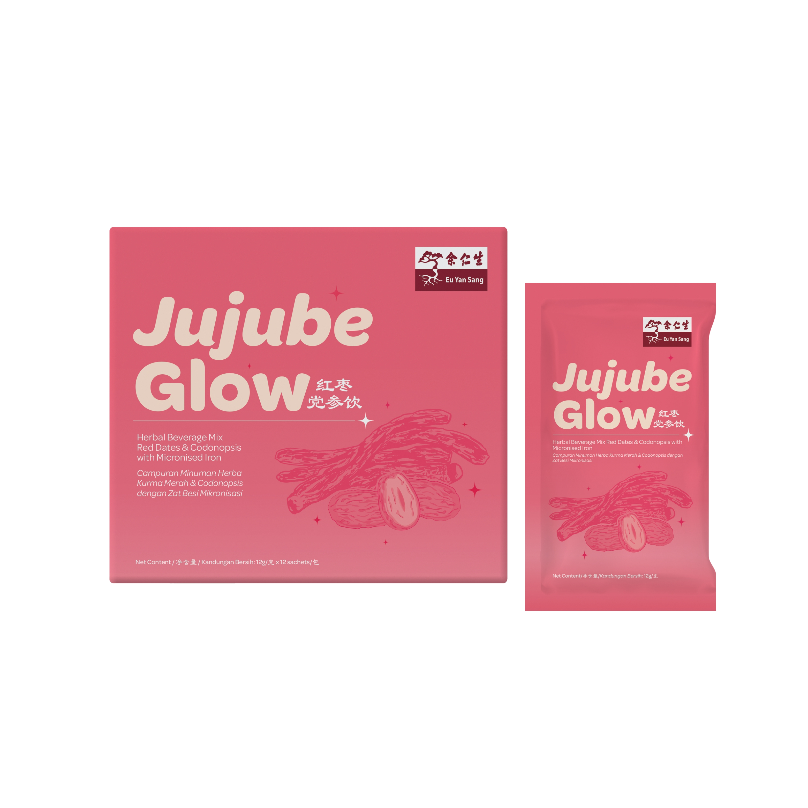 Jujube Glow Herbal Beverage Mix Red Dates & Codonopsis with Micronised Iron is a convenient and tasty herbal drink fortified with microencapsulated iron and folic acid.