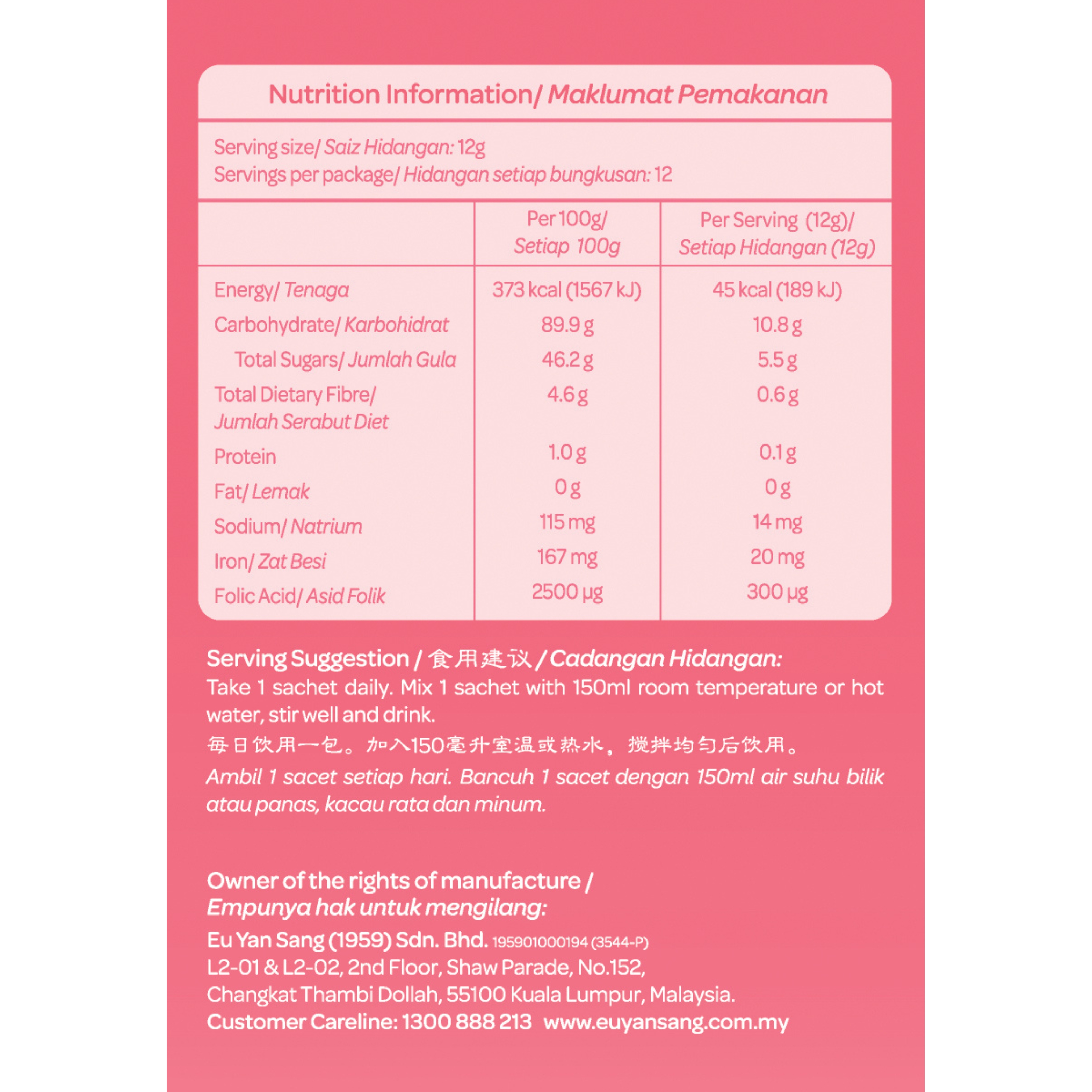 Longan and Red Dates Concentrate, Red Dates (16.7%), Kurma Extract (12.5%), Codonopsis Root Extract (6.7%), Wolfberry Extract (2.9%), Red Dates Extract (2.5%), Iron (as Micronised Iron Pyrophosphate from Lipofer™)(2.2%), Rehmannia Root, Rose Petal Extract, Folic Acid.