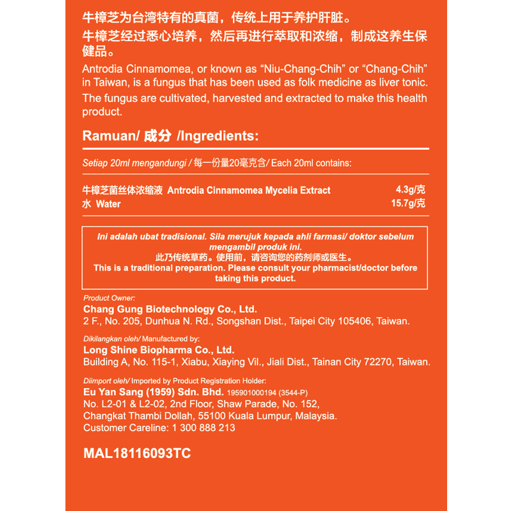 Antrodia Cinnamomea, or known as "Niu-Chang-Chih" or "Chang-Chih" in Taiwan, is a fungus that has been used as folk medicine as liver tonic. The fungus are cultivated, harvested and extracted to make this health product.