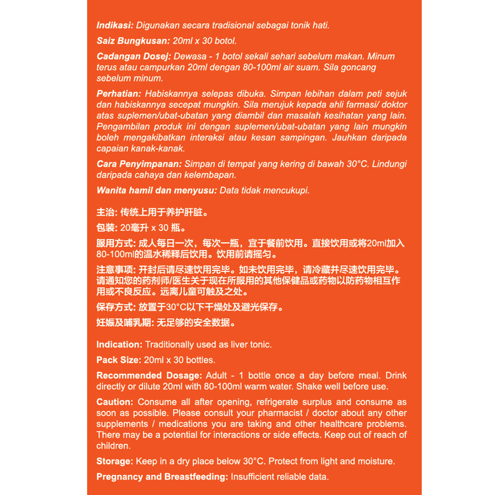 Adult - 1 bottle once a day before meal. Drink directly or dilute 20ml with 80-100ml warm water. Shake well before use.