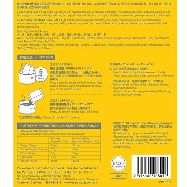 Eu Yan Sang Pear & Figs Soup is prepared with high temperature sterilization technology. No added preservative, additives, colouring and flavouring substances and yet preserving the original taste and safe for consumption. Ready to serve after opening pr reheat for better taste.
