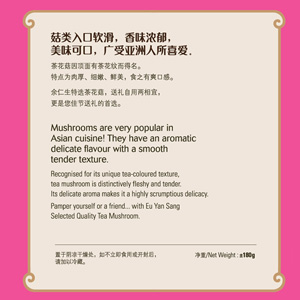 Recognised for its unique tea-coloured texture, tea mushroom is distinctively fleshy and tender. Its delicate aroma makes it a highly scrumptious delicacy. Pamper yourself or a friend... with Eu Yan Sang Selected Quality Tea Mushroom.