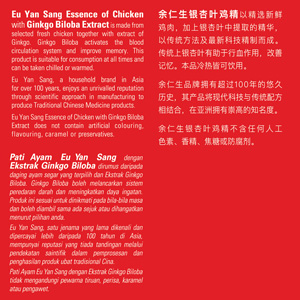 余仁生银杏叶鸡精以精选新鲜鸡肉,加上银杏叶中提取的精华,以传统方法及最新科技精制而成。传统上银杏叶有助于行血作用,改善记忆。本品冷热皆可饮用。