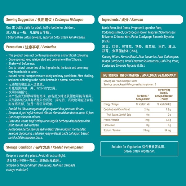 黑豆、红枣、炙甘草、党参、虫草花、玉竹、淮山、茯苓、虫草菌丝体(1.5%)