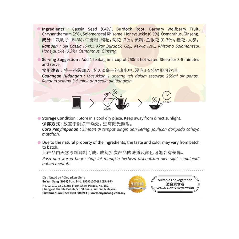 食用建议:将一茶袋加入1杯250毫升的热水中,浸泡3-5 分钟即可饮用。