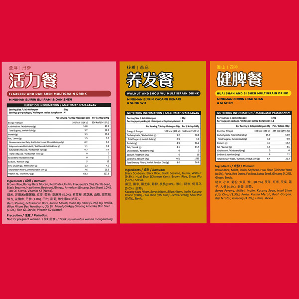 黑豆、黑米、黑芝麻、菊粉、核桃(9.8%)、淮山、糙米、何首乌(5%)、甜菊。