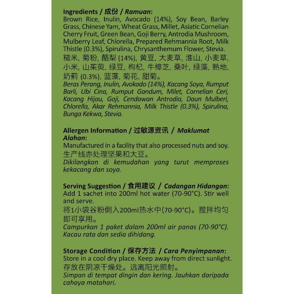 糙米, 菊粉, 酪梨(14%), 黄豆, 大麦草, 淮山, 小麦草, 小米, 山茱萸, 绿豆, 枸杞, 牛樟芝, 桑叶, 绿藻, 熟地, 奶蓟(0.3%), 蓝藻, 菊花, 甜菊。