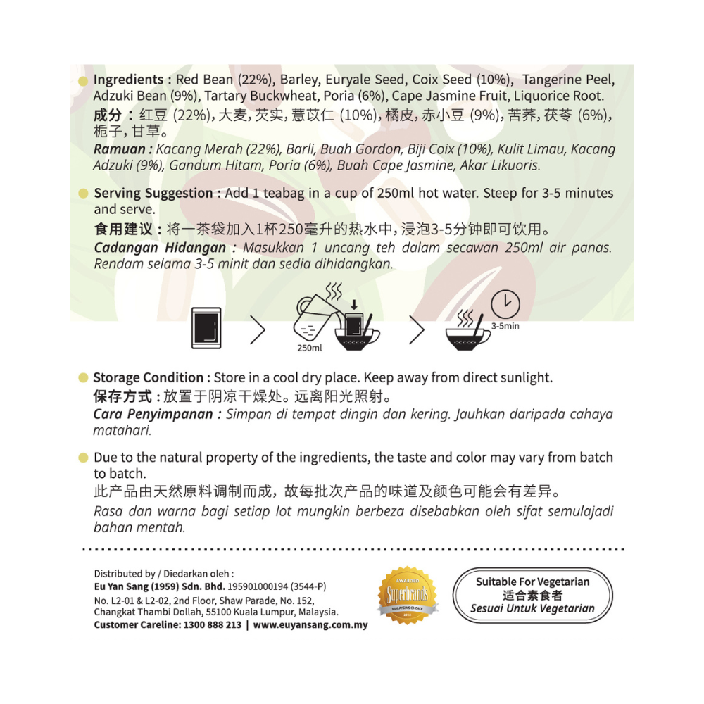 食用建议:将一茶袋加入1杯250毫升的热水中,浸泡3-5 分钟即可饮用。